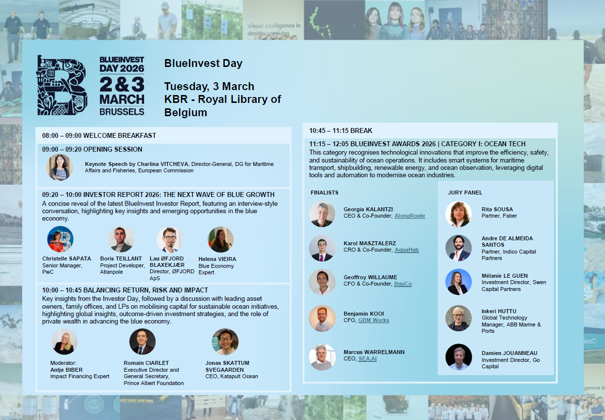 The ninth edition of BlueInvest Day returned to Brussels on 2-3 March 2026, bringing together leading innovators, investors, corporates, and public‑sector actors shaping the future of the sustainable blue economy. Over two days, participants explored new financing paradigms, emerging technologies, and investment opportunities driving ocean‑positive growth across Europe and beyond.